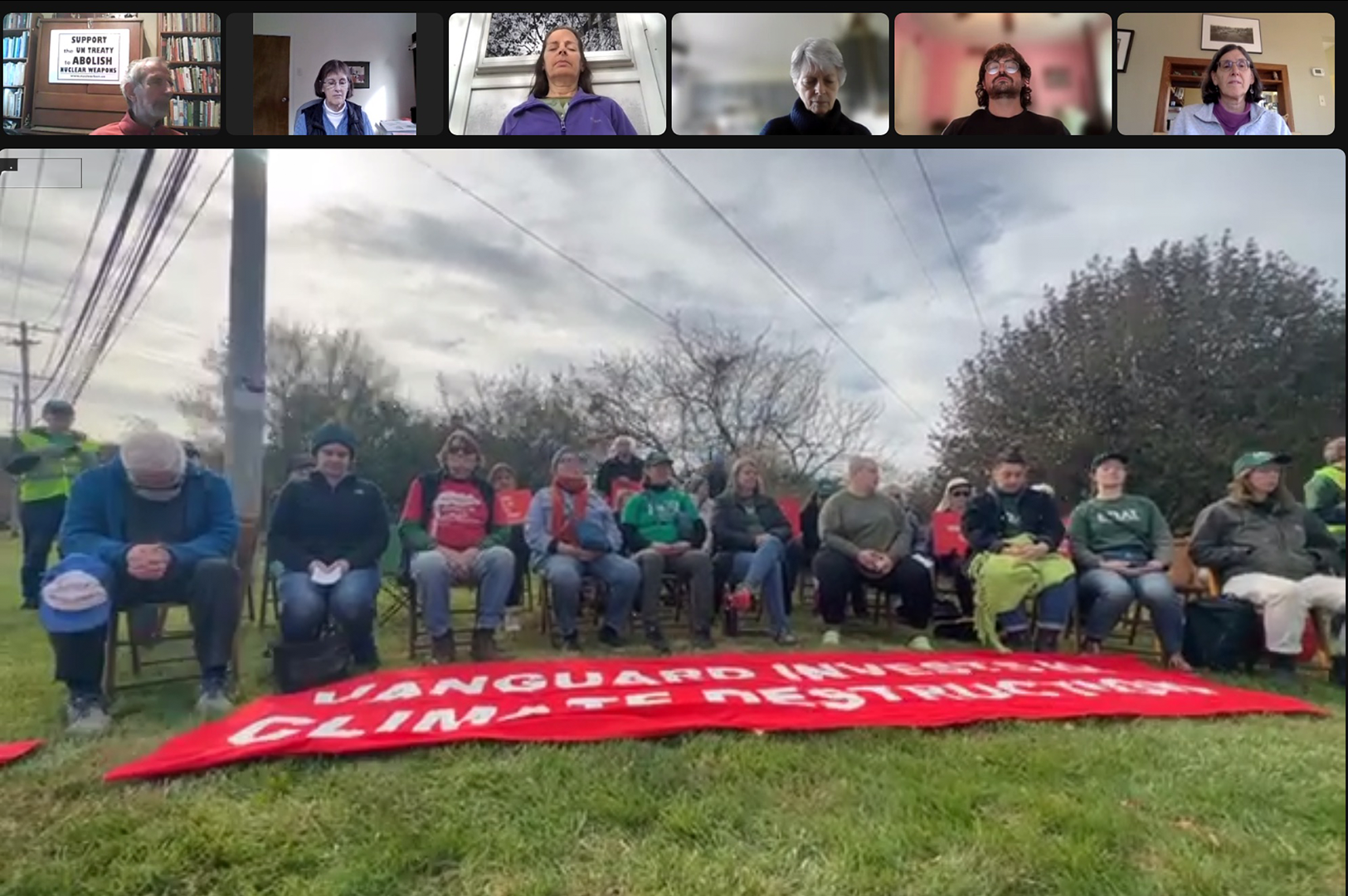 These meetings for worship were part of an international campaign, called “Vanguard S.O.S.” Through protests, phone calls, letters, petitions, and other actions over the past two years, we have been asking Vanguard to use its influence as a major shareholder to push the companies it invests in to significantly reduce their emissions, and exit its investments in fossil fuel companies that refuse to transition their businesses to be in alignment with a livable future.