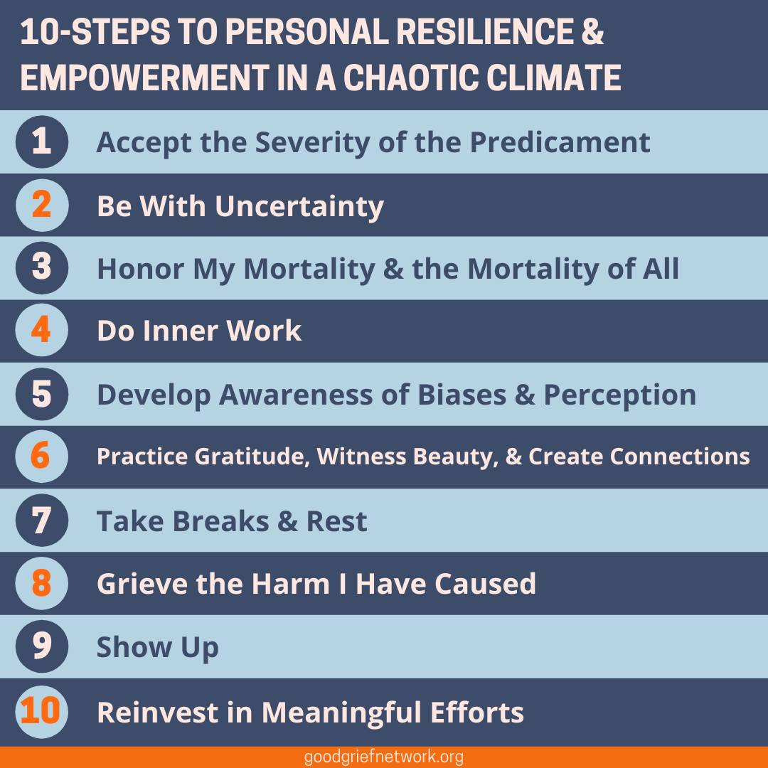 Gayle Matson of Chico Meeting in California and I trained with the Good Grief Network, whose 10-step model offered a graceful entry into the topic of ecological grief. Their model is inspired by the 12-Step family groups and is designed to “help folks recognize, feel, and process their heavy emotions, so that these feelings may be transformed into meaningful action.”