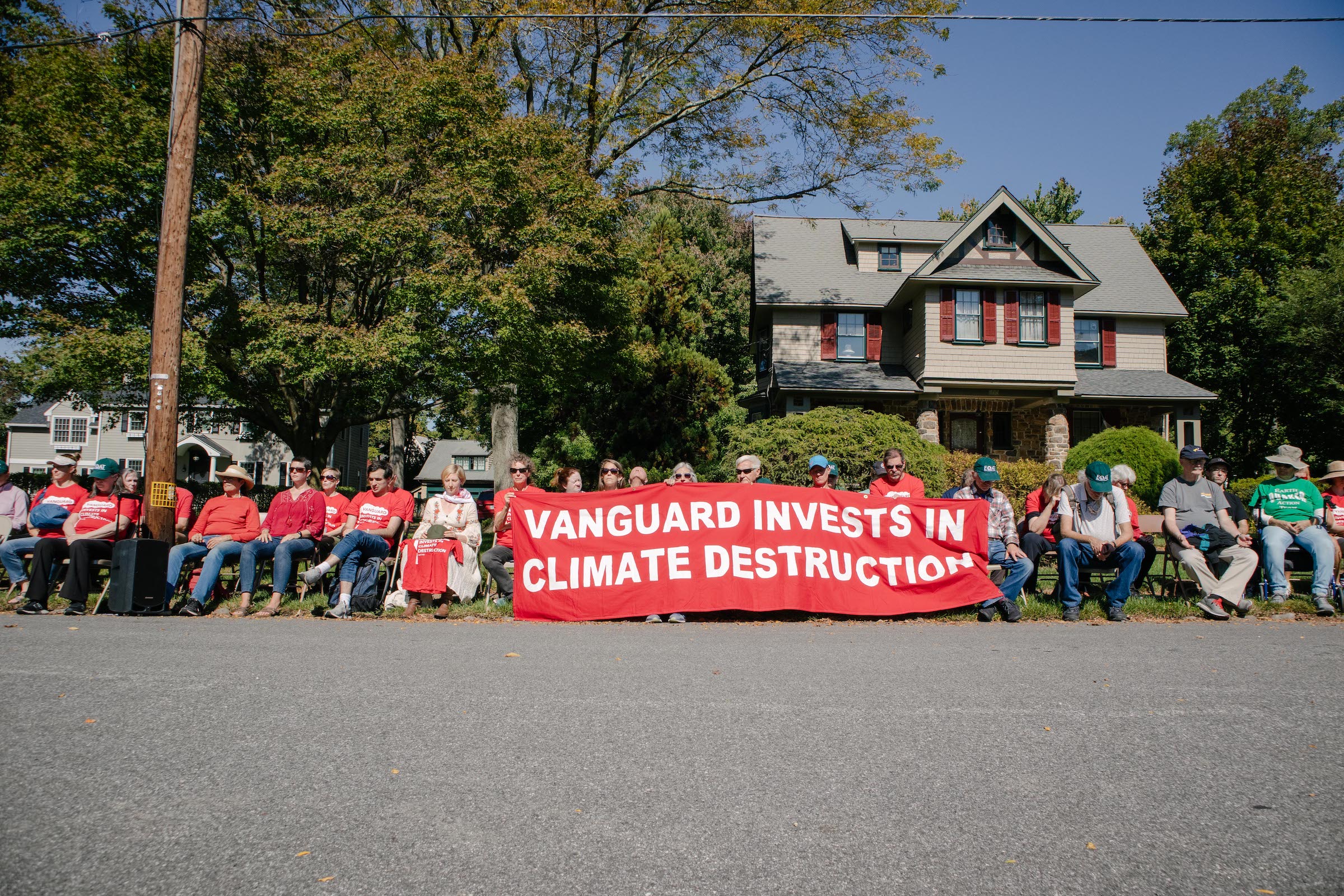 Almost fifty members of Earth Quaker Action Team (EQAT) walked ten minutes from a train station outside of Philadelphia, Pennsylvania, to a quiet Main Line street where they unfolded metal chairs and sat down for thirty minutes of powerful Quaker-style silent worship across from the home of Tim Buckley, CEO of Vanguard.
